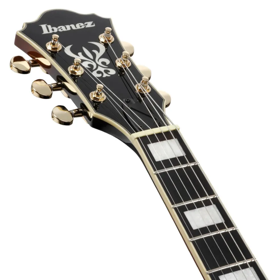 The left handed AS93FM features a 3-Piece Nyatoh/Maple neck that provides a rich mid-low end and great resonance and a Macassar Ebony fretboard that produces tight lows and mid range along with strong attack in the highs and quick response with rich sustain. The Gibraltar Performer bridge provides rich sustain and tuning stability. The low-positioned saddles promise comfortable playability. The Quik Change III tailpiece enables faster and easier string changing.