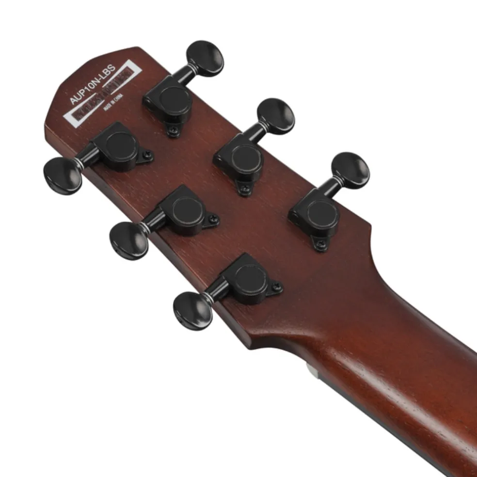 The AU series features very unique construction. Rather than being built with a separate top, sides, and back like most ukuleles, the body of the AU starts as a solid block of wood and is routed out, so that the back and sides are a single piece of wood. A top is then added to complete the body. This construction method gives these instruments a unique sound and brilliant playability. They also utilize distinctive features such as a Stereo Sound Port, Elevated Comfort Armrest, and Edgeless Comfort Heel.
