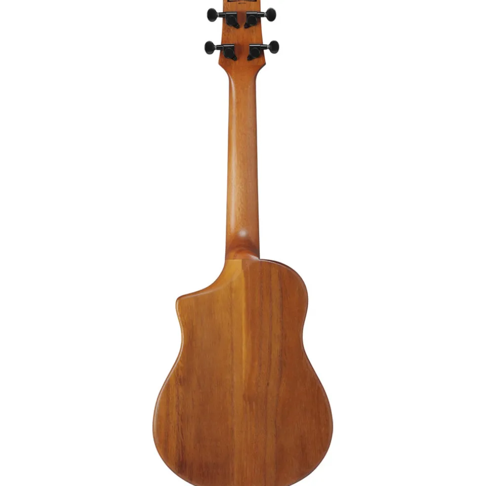 The AU series features very unique construction. Rather than being built with a separate top, sides, and back like most ukuleles, the body of the AU starts as a solid block of wood and is routed out, so that the back and sides are a single piece of wood. A top is then added to complete the body. This construction method gives these instruments a unique sound and brilliant playability. They also utilize distinctive features such as a Stereo Sound Port, Elevated Comfort Armrest, and Edgeless Comfort Heel.