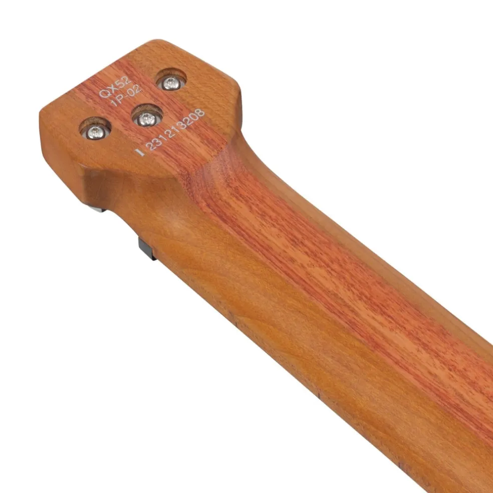The QX52 features a lightweight solidbody with an ergonomic nyatoh construction, topped with a stunning poplar burl for a unique aesthetic. Despite its compact profile, the guitar produces rich, woody tones that defy its size.