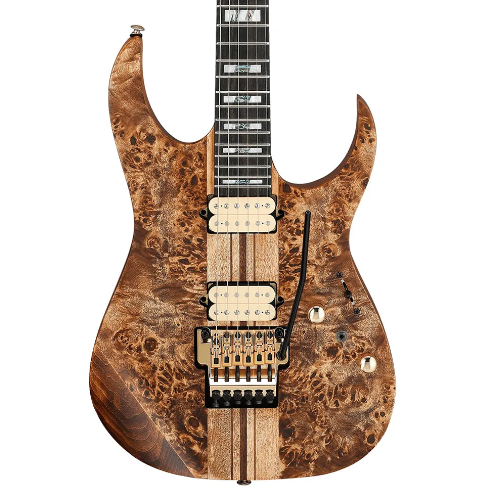 The Ibanez RGT1220PB Premium features a Poplar Burl Top with an exotic wood grain and the American Basswood body that delivers a natural and flat tone. Ibanez’s thin, flat and fast Wizard neck is strong and sturdy and offers unlimited playability and features a two-octave 24-fret fretboard for a wide tonal range and a Neck-through construction provides massive sustain and playing comfort. Stainless steel frets boast excellent corrosion resistance. The wide and tall fret-type offers a quick response and effortless articulation when playing chords and clear tone when playing single notes, paired with Premium Fret Edge Treatment that offers a super smooth, comfortable performance in an Ebony fretboard that produces tight lows and mid range with a strong attack in the high end and features a quick response and rich sustain, and Gotoh machine heads to provide super precision, smooth feel, and minimal back lush.