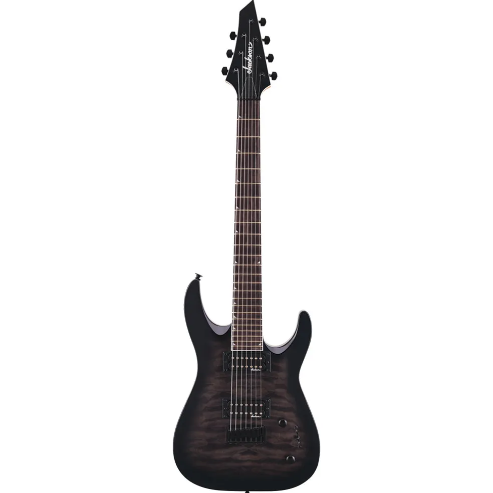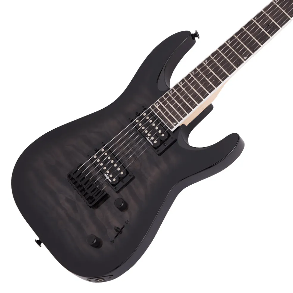 A formidable 7-string beast, the JS Series Dinky Arch Top JS22Q-7 DKA HT is wrapped in a brooding Transparent Black Burst finish with all-black hardware and our Jackson 3×4 AT-1 black headstock.