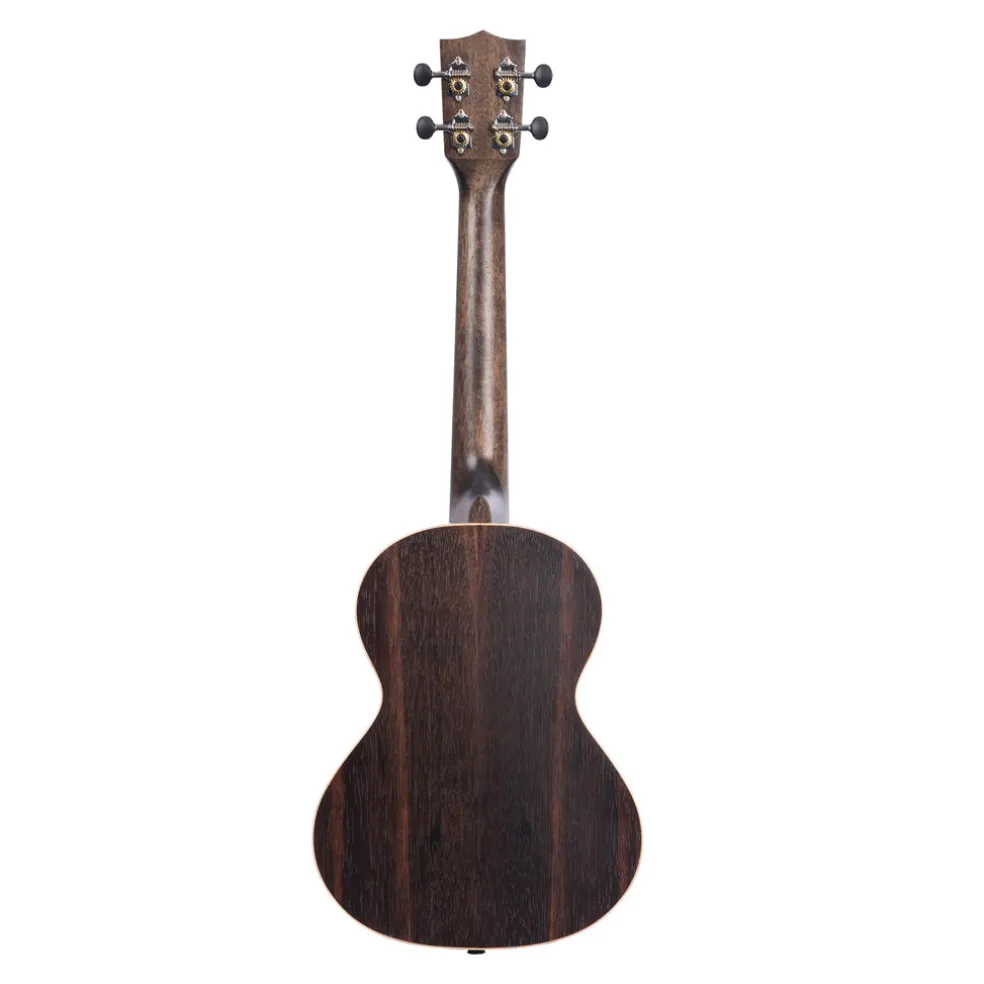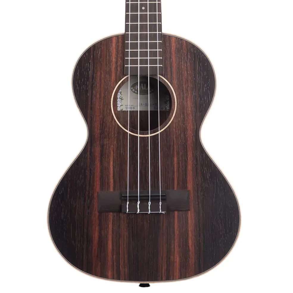 The Ebony line has a deep brown body with reddish-brown striping, finished in satin for a natural look. The light colored Maple rosette and binding creates a nice contrast to the Ebony body.