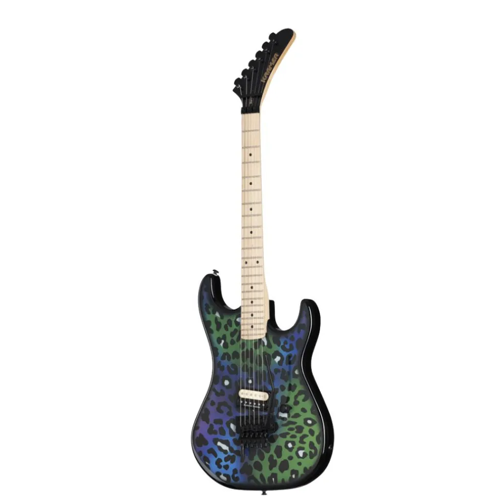 This Leopard is on the prowl and is ready for some shredding. Designed by Kramer Custom Graphic Artist Chris Stemmer and influenced by classic Kramer Leopard graphics, this bright take will make you stand out over other cats for sure! The Baretta Vintage is a tribute to one of the most iconic and original guitar designs in rock. Features an alder body, satin-finished hard maple neck, a single Seymour Duncan® JB™ zebra-coil humbucker, and a Floyd Rose® 1000 series tremolo with an R2 1000 series locking nut. It also comes equipped with an EVH® D-Tuna® and a Floyd Rose LRT-L40 Trem Stop, and it is finished in an eye-catching Rainbow Leopard. A premium gig bag is also included.