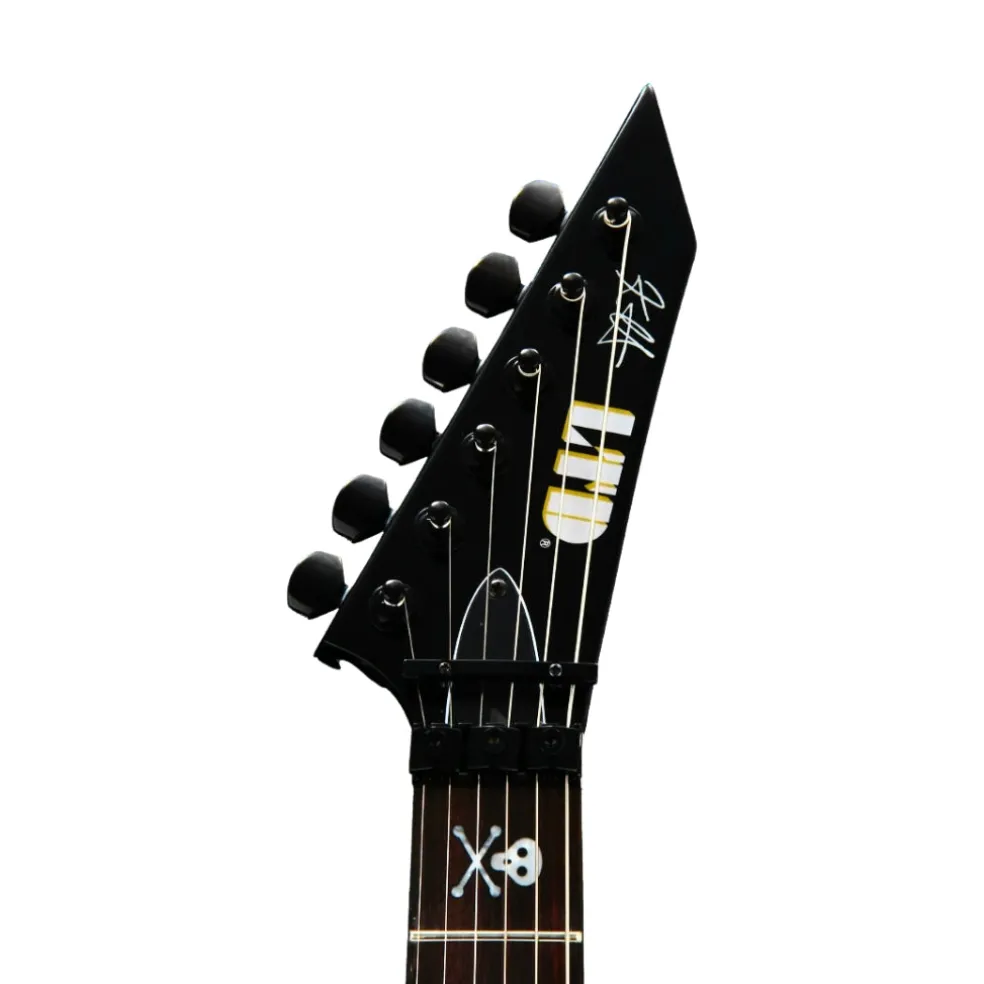 The LTD KH-602 is a Kirk Hammett Signature Series guitar that offers just about everything that its higher-end cousin, the ESP KH-2, does, at a price that more musicians can afford. Check it out: the KH-602 features neck-thru-body construction, with a comfortable alder body, a three-piece extra-thin U-shaped maple neck, macassar ebony fingerboard with 24 extra-jumbo frets and Kirk’s skull-and-bones inlays, and components that include a Floyd Rose bridge and a set of EMG Kirk Hammett Bone Breaker Signature pickups. It’s a powerful guitar designed for professional recording and live performance, perfect for any serious player of intense music. Available in Black finish.
