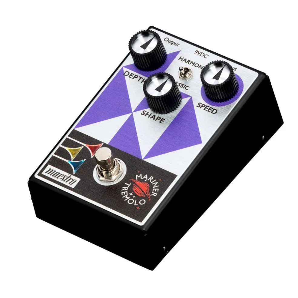 The Maestro Mariner Tremolo offers two amp-like tremolo options for “two pedals in one” functionality and increased sonic versatility. In Classic mode, you can swing from subtle, smooth amplitude modulation all the way to a sharper-edged, biting modulation, with many creative areas to explore in-between. In Harmonic mode, you can dial up timeless textural Harmonic Tremolo tones that are very reminiscent of the tones produced by a select few vintage amplifier tremolos. With its amp-like tones and ability to vary the tremolo’s wave shape, the Mariner Tremolo delivers a wide range of inspiring possibilities. The intuitive 3-knob control layout lets users quickly set the desired Depth (the intensity of the tremolo effect), control the Shape of the waveform (from a triangle wave to a square wave), and adjust the Speed of the tremolo effect. The true bypass footswitch triggers the LED lights in the bugles in the Maestro logo when it’s on, so you’ll always know when the effect is active.