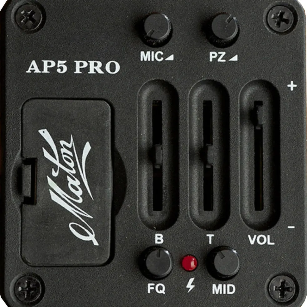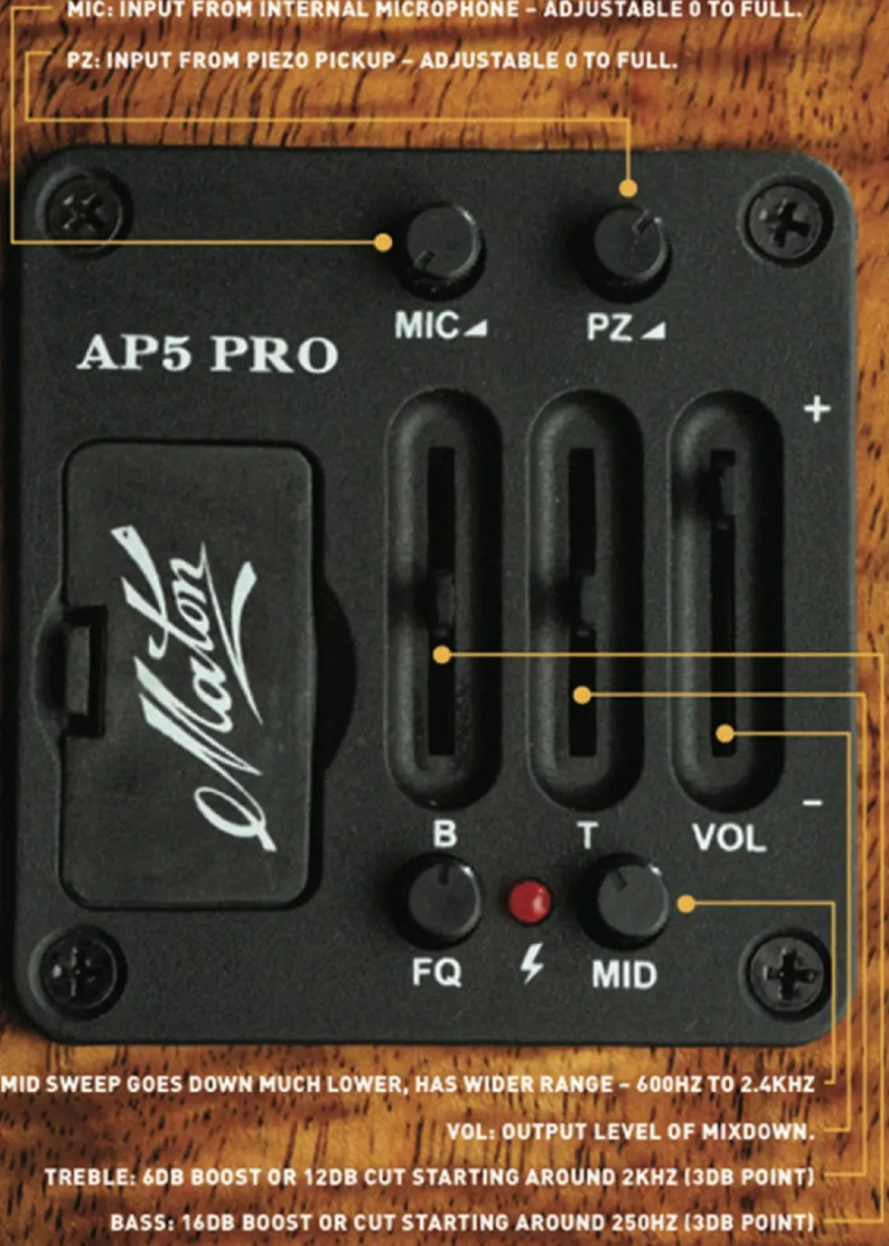 The AP5 PRO now features separate Microphone and Piezo input controls allow for blending of both microphone and piezo levels prior to sending the actively combined signals through to the master volume. Highly selective cardioid microphone system allows for much greater microphone level before feedback in live environments. This newly upgraded microphone is directly mounted to the preamp casing via an adjustable arm, which permits easy final tweaking of microphone position to suit the individual artist’s style.