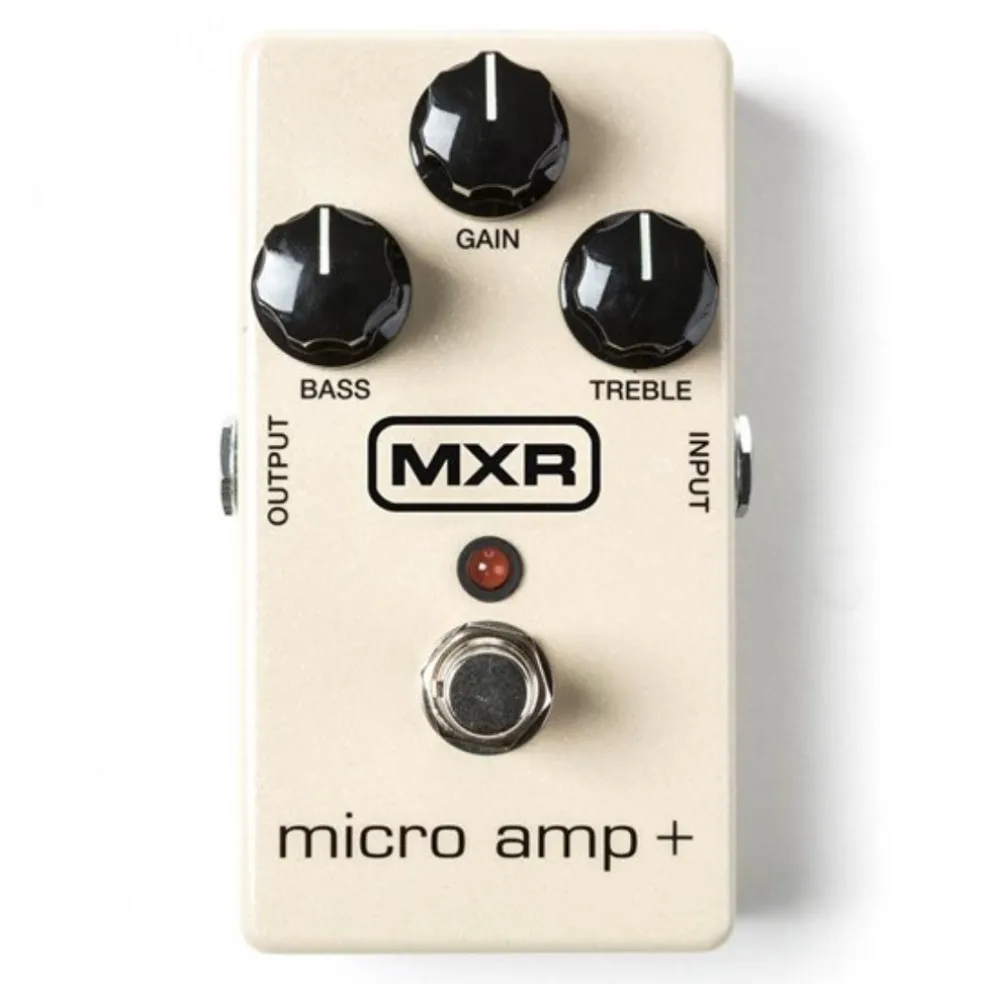 For more than 20 years, the MXR Micro Amp has been a staple among the world’s top artists because of its ability to boost and sweeten up your guitar or bass tone and drive the front of your amp. The Micro Amp+ builds on that classic pedal with EQ controls and other upgrades that take this powerful boost box to the next level. With its Gain knob, the Micro Amp+ allows you to dial up just as much gain as the original—up to +26dB—but with added EQ controls, you can now finely sculpt your boosted signal. For the classic Micro Amp sound, set the Bass and Treble controls to noon. Additionally, the Micro Amp+ now comes equipped with low-noise op amps—so you don’t get any extra noise at super high levels—and true bypass switching. With the sturdy housing and durable components that MXR is known for, this pedal is ready for the road.
