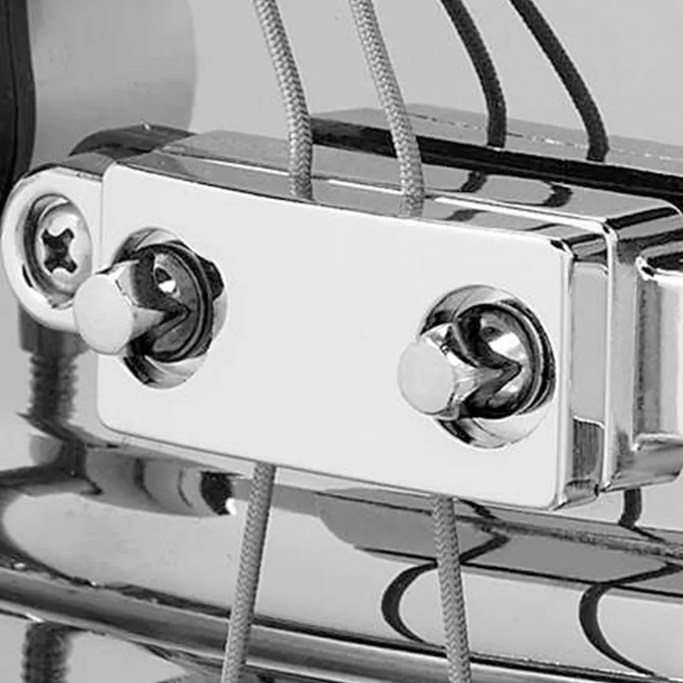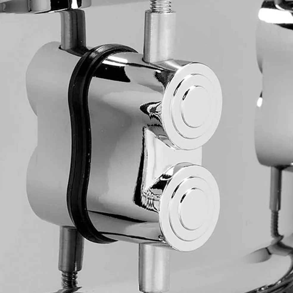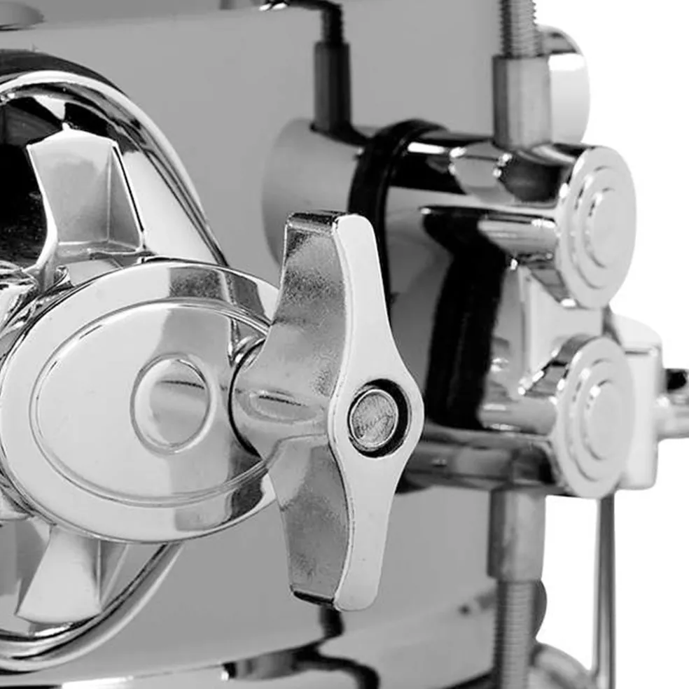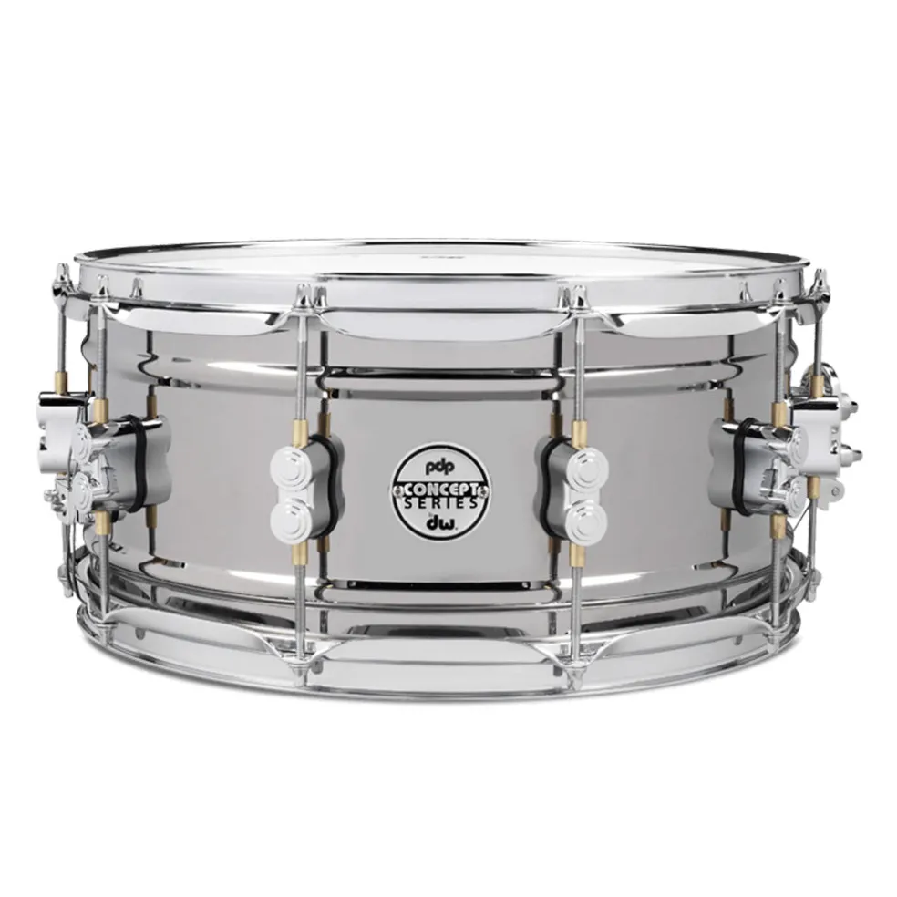 PDP Concept Series Black Nickel Over Steel Snare with Chrome Hardware 14×6.5 dual-beaded, 1mm rolled steel shells plated in a mirror-like black nickel finish. Complemented by dual-turret lugs, the bright, yet dynamic, snares are also fitted with MAG Throw-Offs, True-Pitch Tuning and Remo heads.