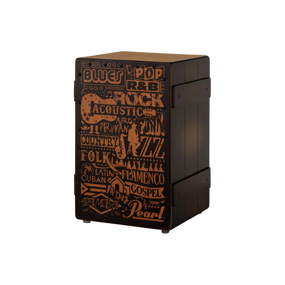 The Music Genre cajon is designed to resemble a wood crate and the faceplate features custom silkscreened art with the names of popular music genres.