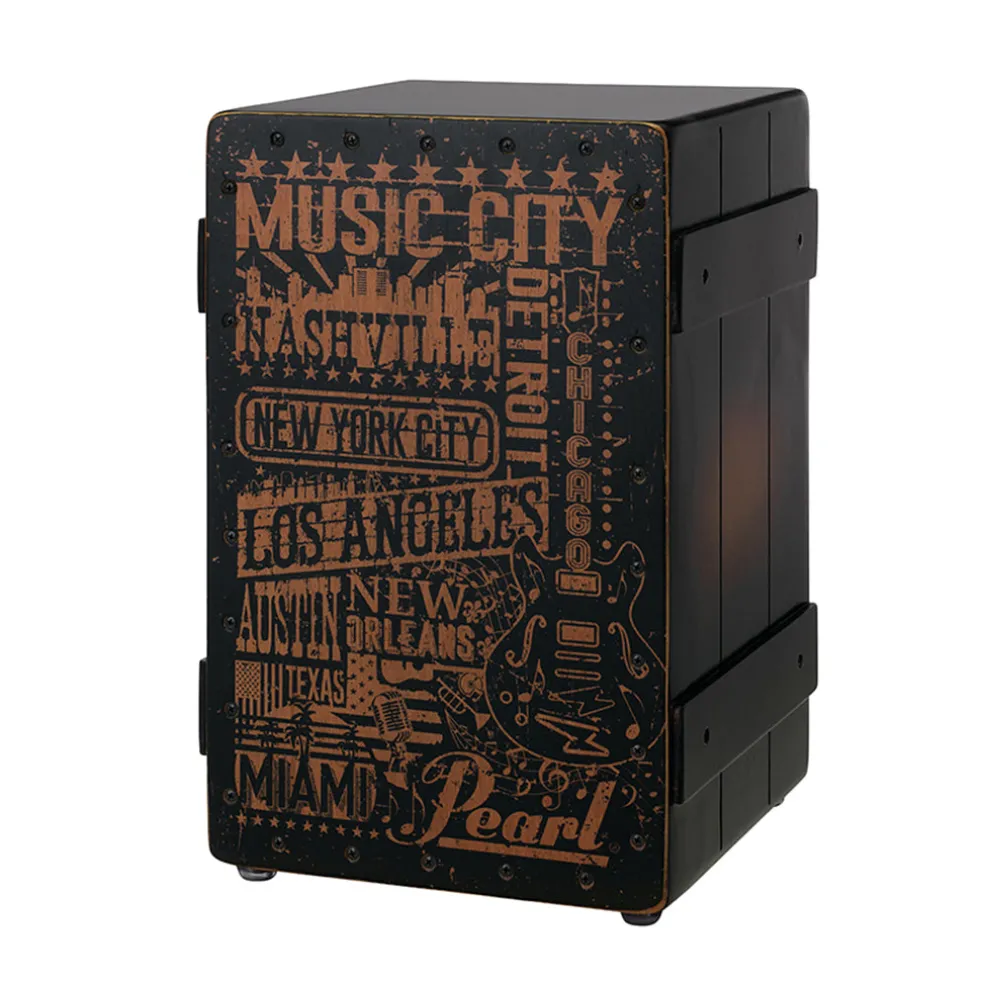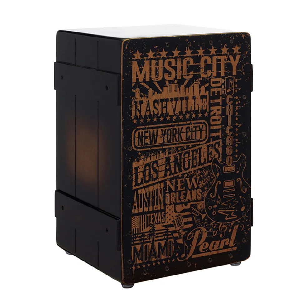 The Music Town USA cajon is designed to resemble a wooden crate and the faceplate features the names of some of America’s iconic music cities.