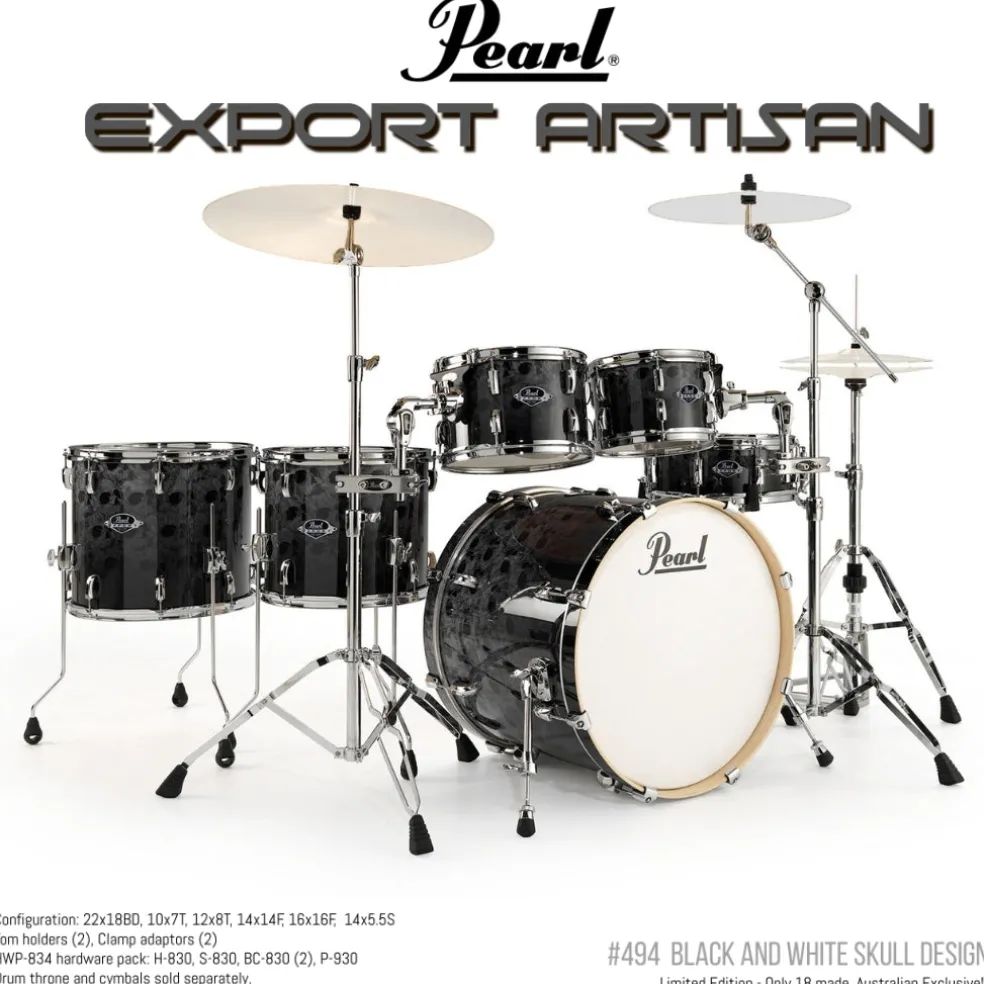 Step into the spotlight with the Pearl EXX Artisan Limited Edition 6-Piece Drum Kit, featuring a bold Black & White Skull wrap finish. Designed for beginners and serious players alike, this Export Series kit delivers the legendary Pearl quality with a powerful tone and rock-solid durability. Its 6-ply Poplar/Mahogany shells provide exceptional resonance, while the included 830 Series hardware and P-930 kick pedal ensure a complete drumming experience right out of the box.