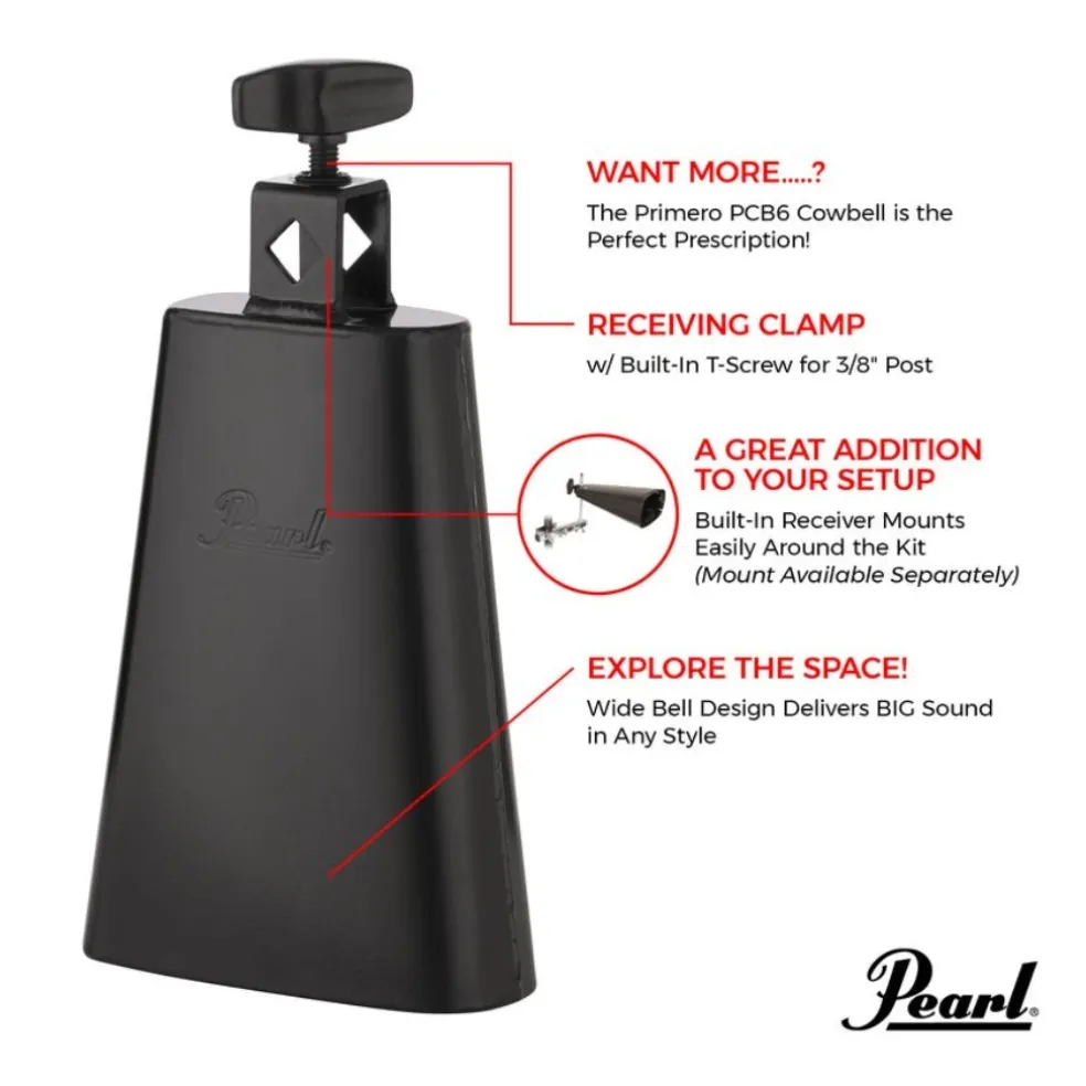 Primero Series cowbells are perfect for adding to your drum set or percussion rig and can be played mounted or hand-held. The 4 PCB4 produces a high pitch and the 6 PCB6 produces a low pitch.
