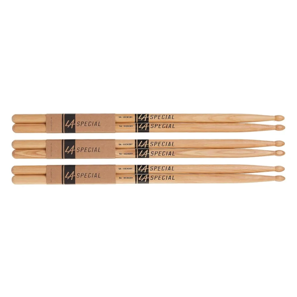 Upgrade your drumming experience with three pairs of our best-selling LA Specials 5A drumsticks, crafted from premium hickory—the top choice for drummers worldwide. Known for its unmatched resilience, responsiveness, and durability, hickory delivers a natural feel that enhances your playing whether you’re performing live or recording in the studio.