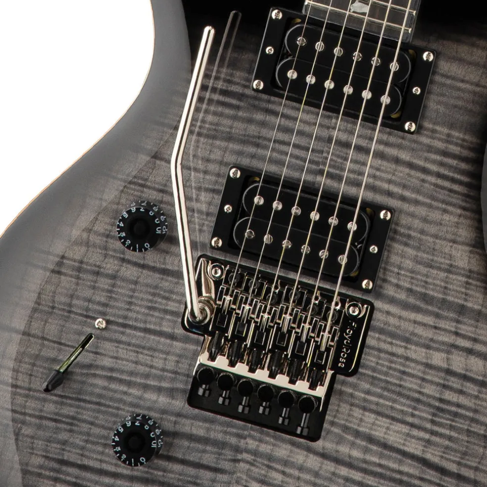 The PRS SE Custom 24 “Floyd” brings the legendary Floyd Rose bridge to PRS’s most-famous model: the Custom 24. The Floyd Rose 1000 Series Tremolo gives players new phrasing options and the confidence to flutter or dive bomb without going out of tune. Additional appointments include a 24 fret, 25” scale length, wide thin maple neck, the 85/15 “S” pickups that deliver remarkable clarity and extended high and low end (no mud when you go for the throat!), and includes a gig bag. So dive, bend, play with harmonics, and have fun with the SE Custom 24 “Floyd” guitar…it can take whatever you’ve got.