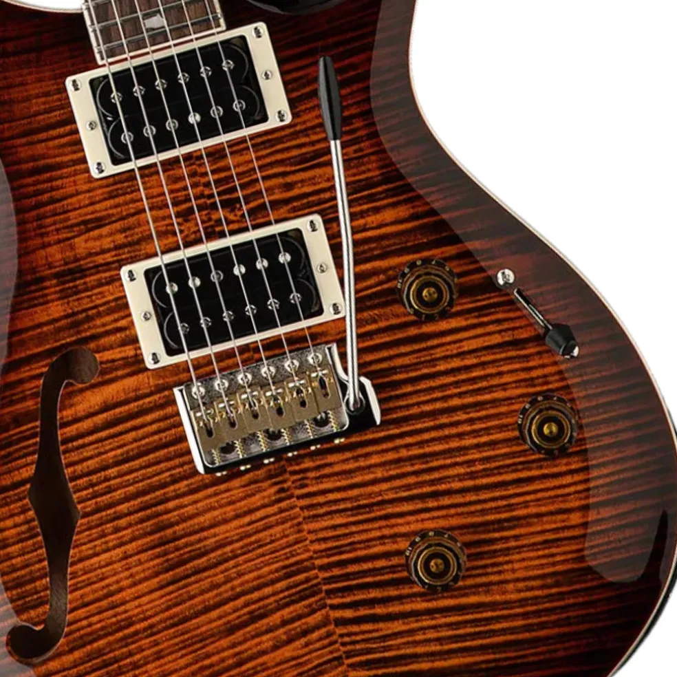 The PRS SE Custom 24 Semi-Hollow Piezo is a highly sophisticated and incredibly versatile instrument. A solidbody guitar with a maple top, mahogany back, dual humbuckers, and the patented PRS tremolo, the Custom 24 is the original PRS design first introduced in 1985. This semi-hollow version adds natural resonance and a vibrant, organic tone. The humbuckers in this model are PRS 85/15 “S” pickups, which can be tapped via the push/pull tone control for more sounds. The addition of the LR Baggs/PRS Piezo system furthers the instrument’s versatility by offering electric and acoustic tones in one guitar.