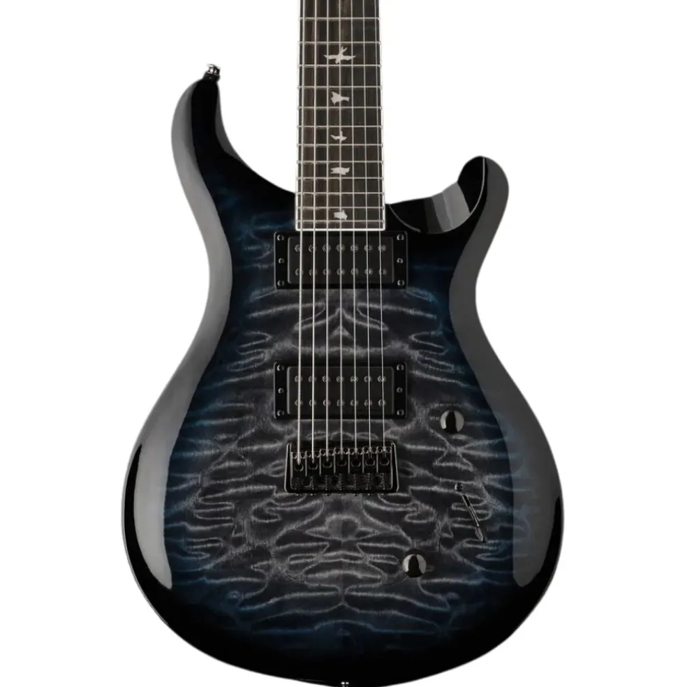 The SE Mark Holcomb SVN model truly stands on its own in the PRS lineup and delivers addictive playability thanks to some unique specifications, including a 24-fret, 26.5” scale length, wide thin satin maple neck with 20” radius ebony fretboard. Holcomb’s signature Seymour Duncan Scarlet and Scourge 7-string pickups provide the right amount of output and articulation whether you’re playing sophisticated chords or solos and whether you’re playing alone or working in the mix of a band. Other specifications include black hardware, a 3-way blade pickup switch with push/pull tone knob for coil splitting, and a quilted maple veneer. The model is topped off with coil-splits for the pickups and a string-through, plate-style, 7-string bridge.