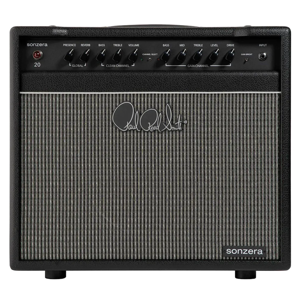 The Sonzera 20 is a moderately powered 20-watt combo amplifier with two independently controlled, footswitchable channels designed for maximum versatility. The clean channel delivers full, 3D tones reminiscent of American mid-1960’s amplifiers. The gain channel is related to the clean channel circuit-wise, so that it can be set up to act as a boosted clean channel or manipulated to make the channels sound like two completely different amps (the gain channel can be set from slight to very heavy distortion by simply using the drive and level controls). The bright switch on the gain channel has been carefully tailored to deliver familiar high-end snap and is particularly effective on the low strings, neck pickup settings, and with singlecoils, while the low-end response of the gain channel is full, tight, and clear.