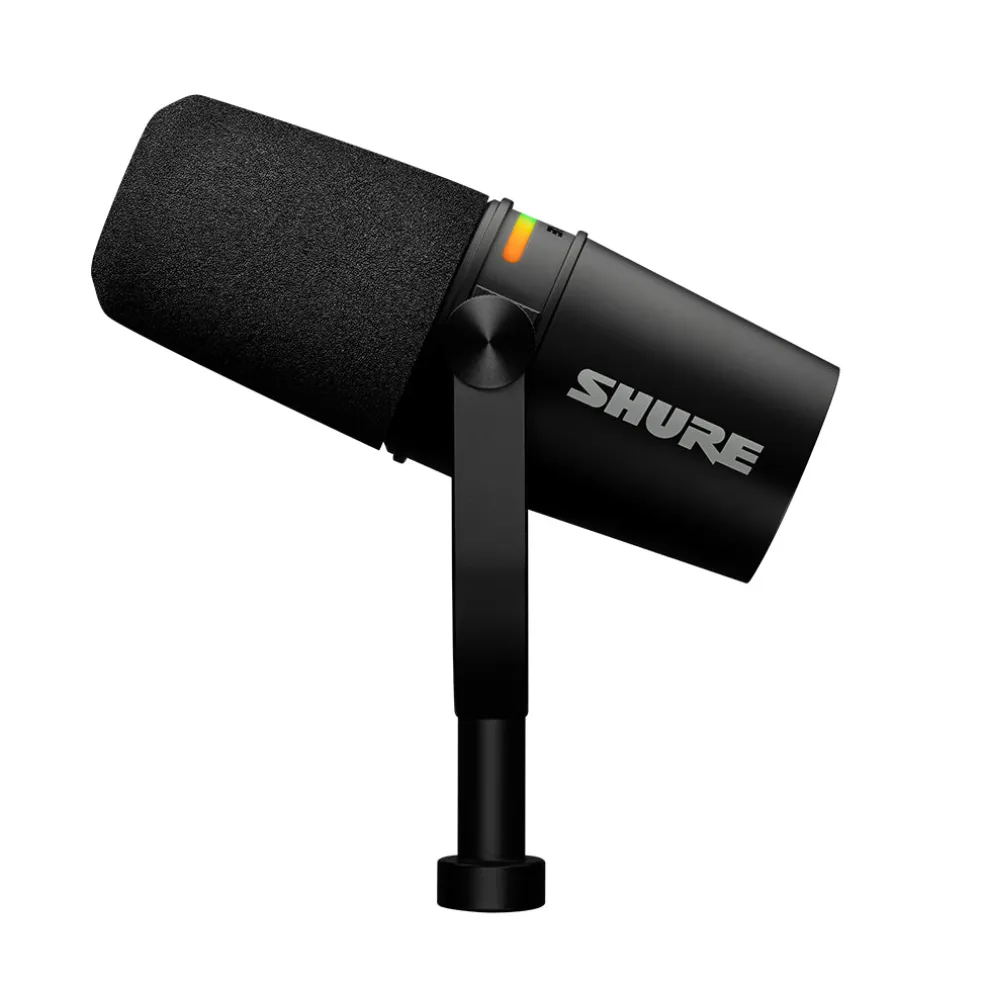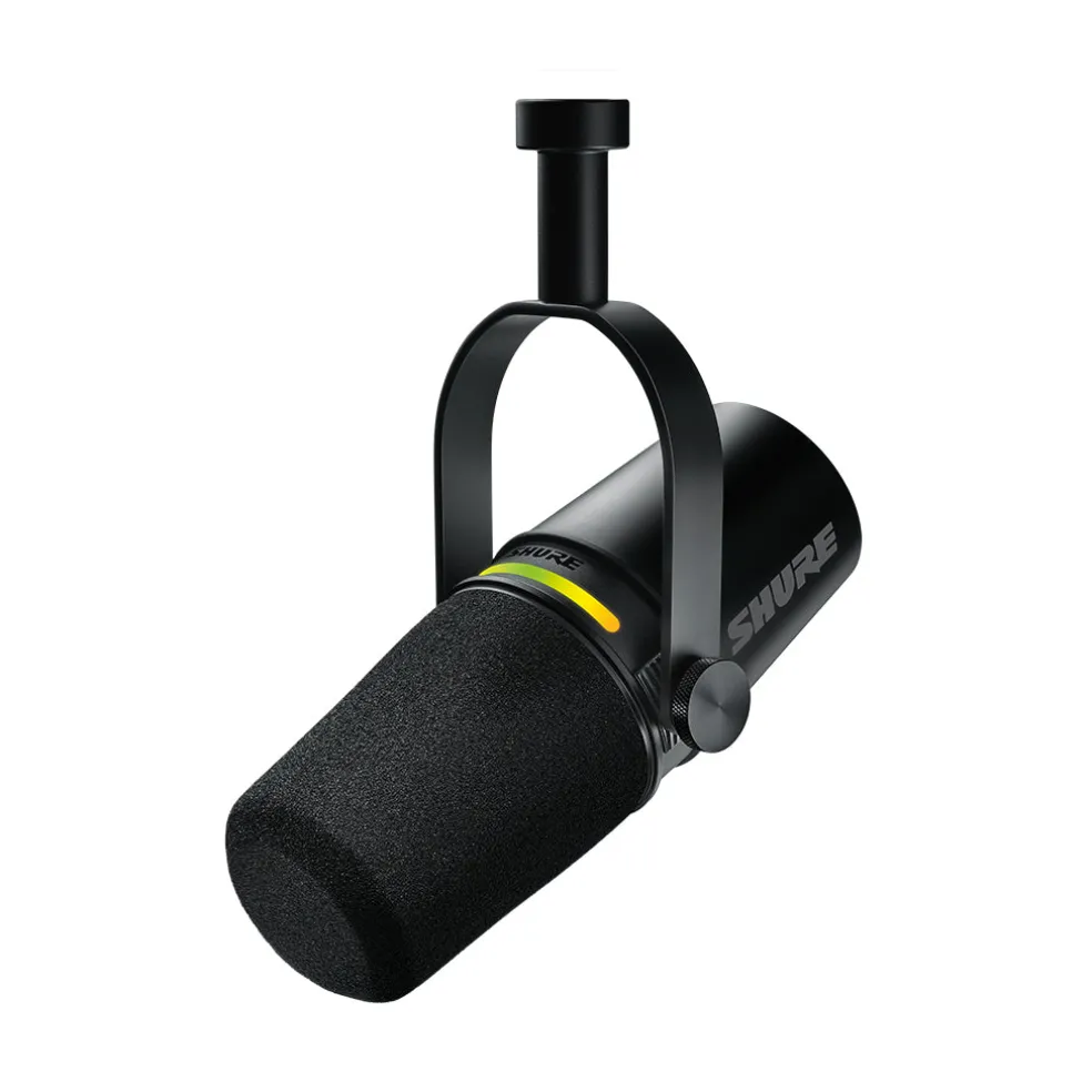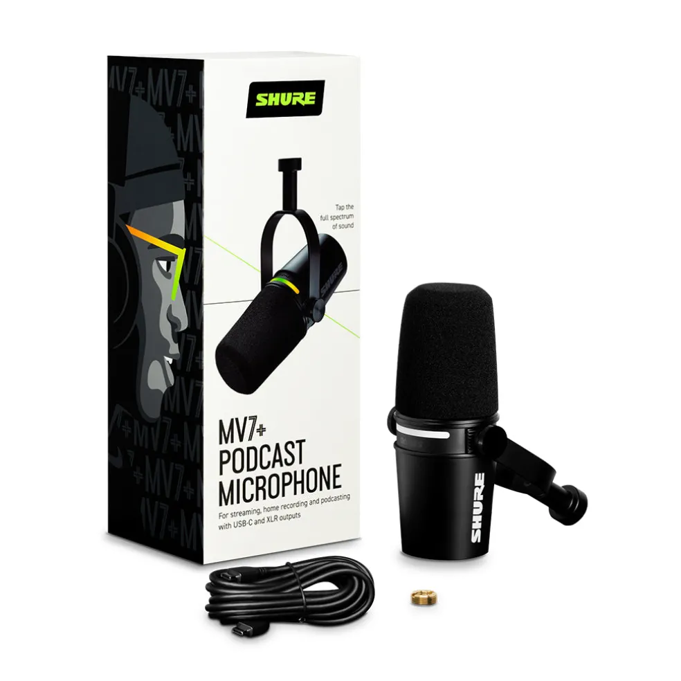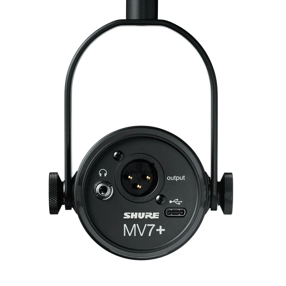 The Shure MV7+ is the updated version of a dynamic microphone designed to capture high-quality audio for podcasting, streaming and music making via hybrid USB-C and XLR outputs. It has a customizable LED touch panel that can display millions of color combinations while acting as a live audio level meter. When using the USB-C output with the MOTIV Mixâ„¢desktop app or MOTIV mobile apps, the MV7+ can access DSP features such as a Digital Popper Stopperâ„¢, real-time Denoiser and 3 types of reverb, as well as gain, EQ, compression and more. The microphone has a durable die cast aluminum design with an adjustable yoke.