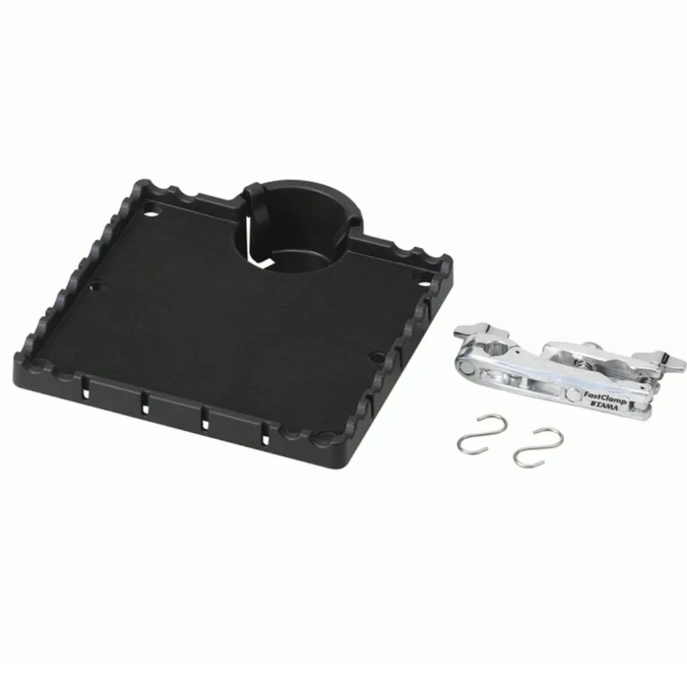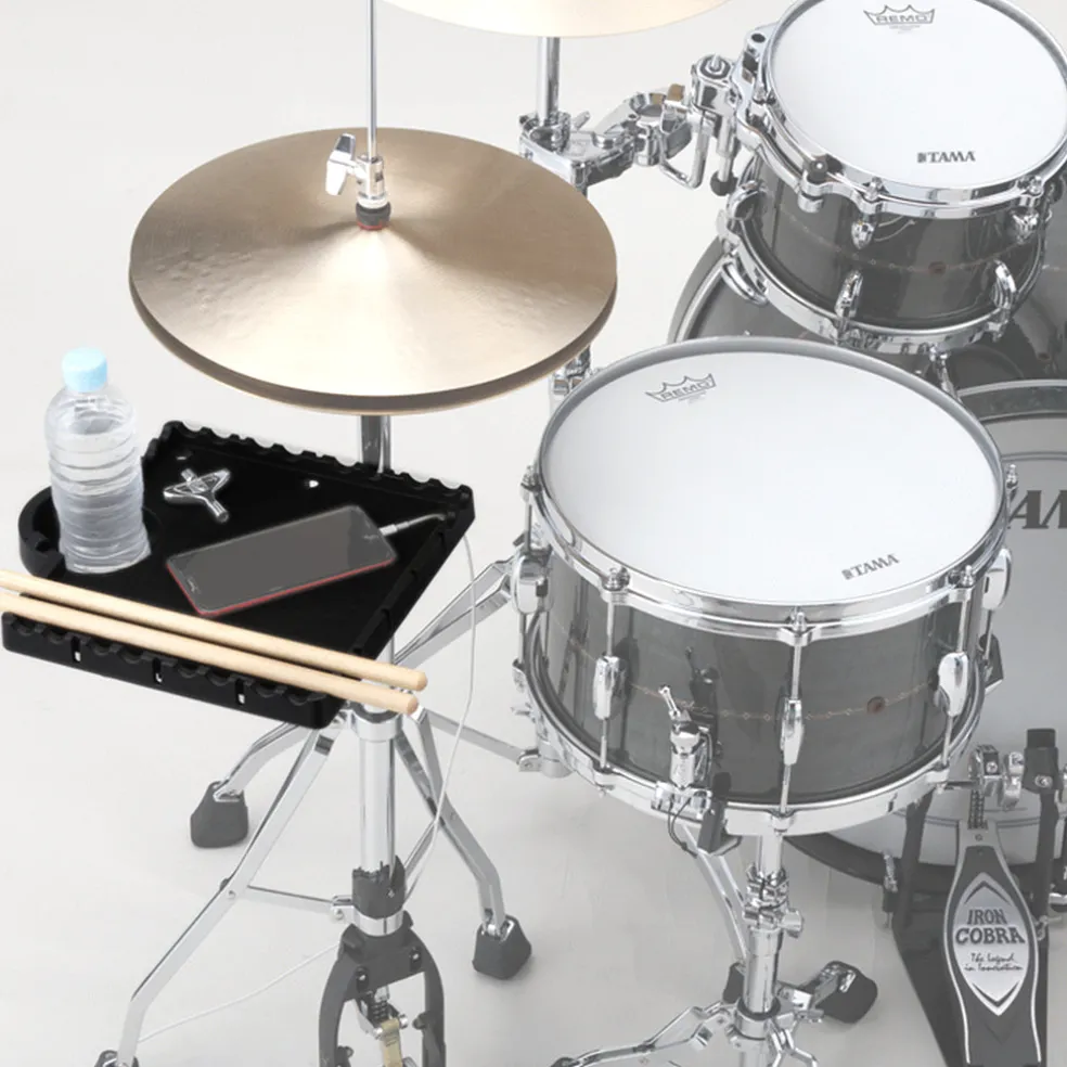 Designed to hold essential items for any performance, the TAT10 Accessory Tray includes a cup holder, unique edges specially shaped for drumsticks, and S-hooks to hang bags or other items.