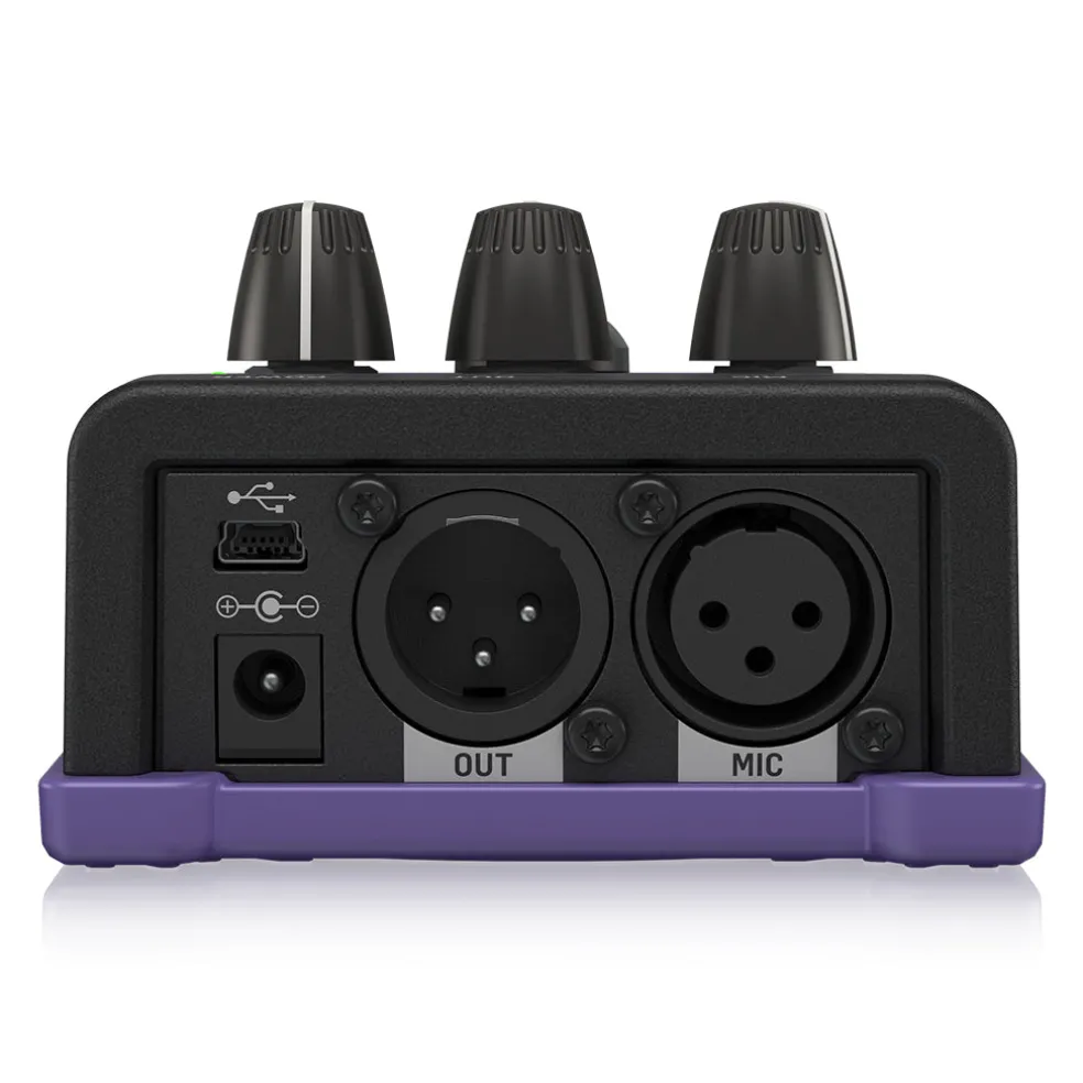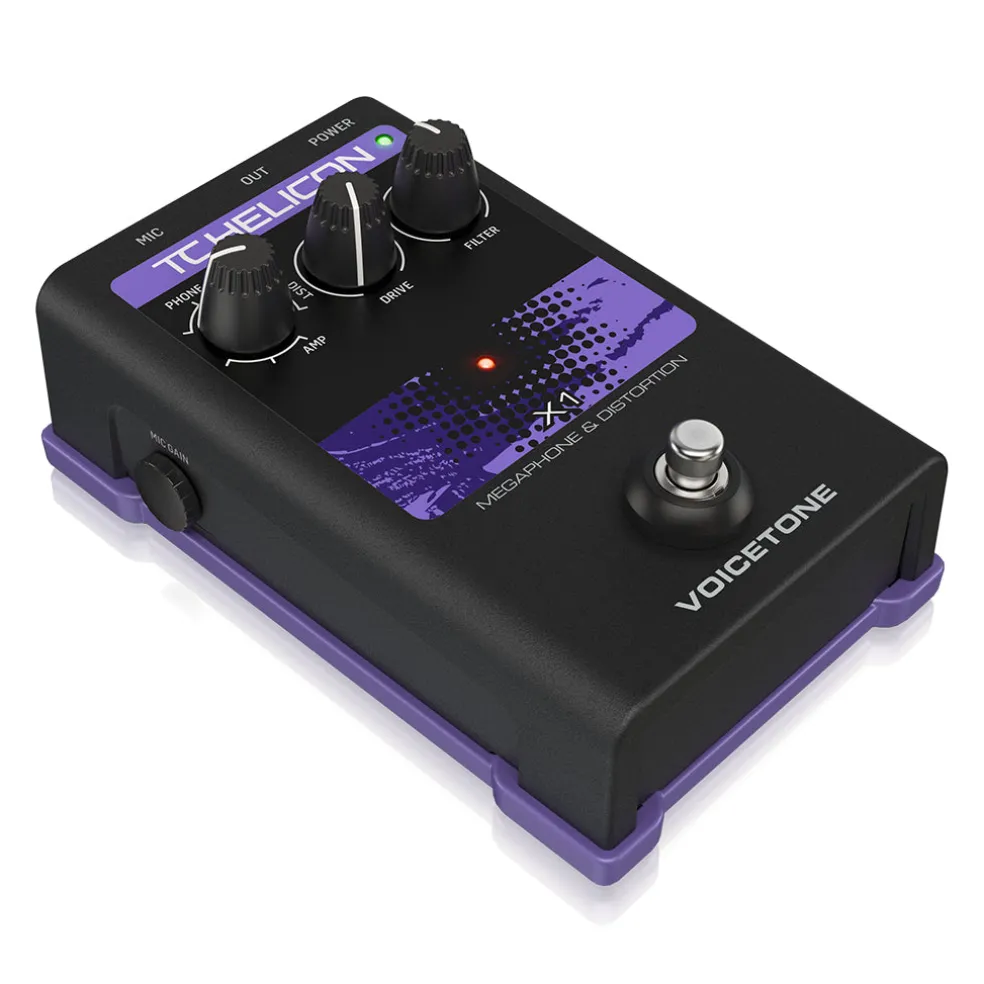 Single-button vocal stompbox with megaphone and distortion filter effects for an extreme sound
