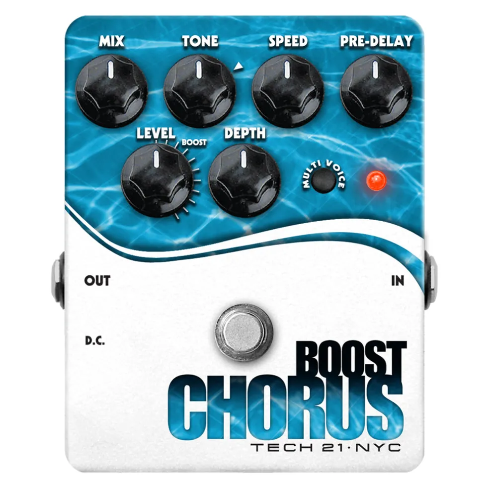 Designed primarily for guitar (but sounds great on everything else) the Boost Chorus features unprecedented tweakability for this type of pedal. No fewer than six controls allow players to easily dial-in the right tone, speed and depth of the effect. The Mix control allows a 0-100% wet blend of the effect, while the Level control offers increasing amounts of boost to compensate for the volume loss perceived with chorus. The final control is the Pre-Delay, which alters the chorus’ range to produce effects from flange/chorus, to regular chorus, to chorus/doubler. The secret weapon is the Multi Voice switch. Engage this to bask in the multiple chorus voices of an Ensemble-style effect.