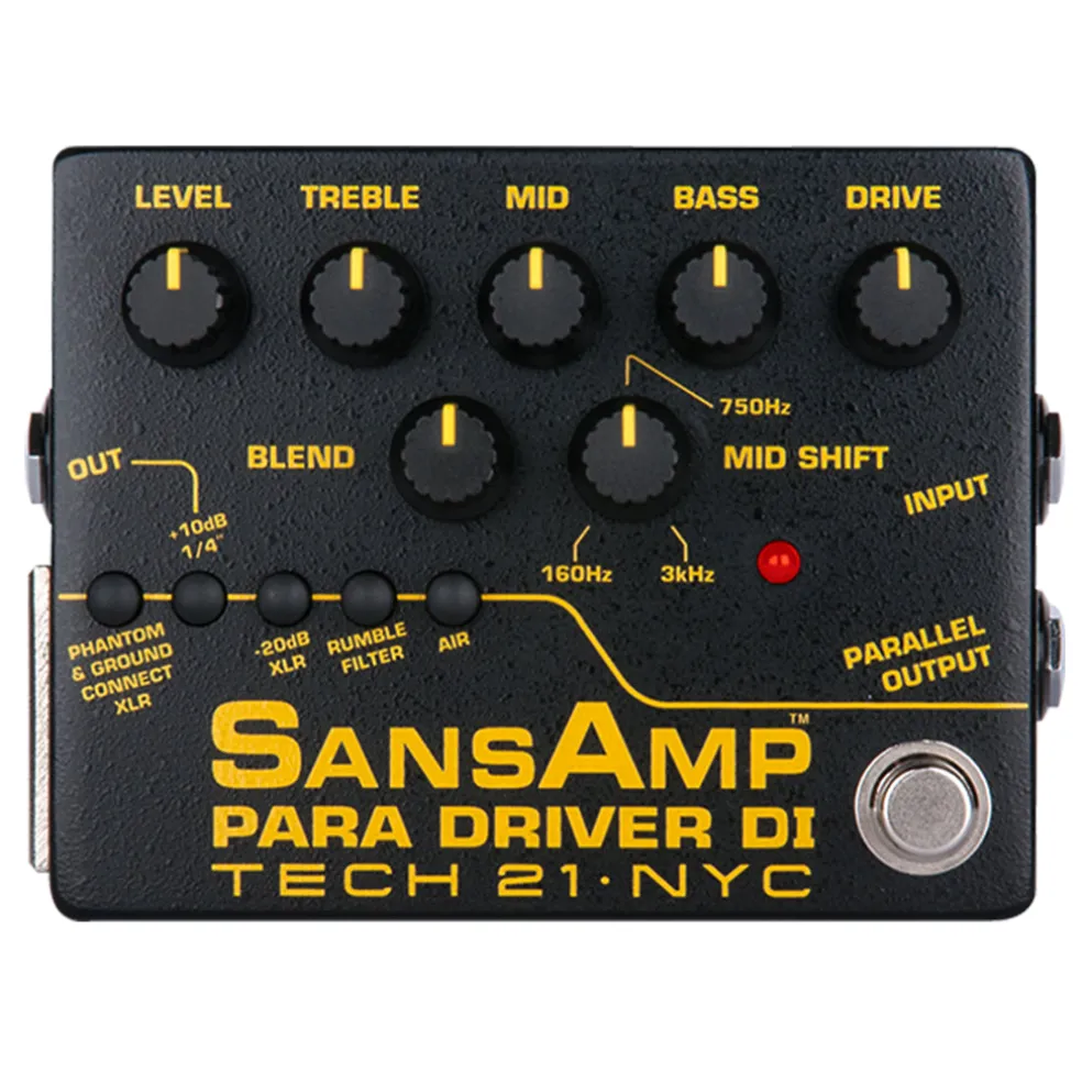 This floor version of Tech 21’s RPM rackmount provides the same detailed tone shaping possibilities for any signal source. It is particularly useful with acoustic, electric and bass guitars, and upright bass, either direct to a mixing console or with an instrument amplifier. The Para Driver DI gives your instrument a natural warmth and presence, as if miking it through a tube pre-amp. The SansAmp circuitry eliminates the harsh, unnatural harmonics of piezo pickups, while the Drive control offers some tasteful edge — just a little or over-the-top.