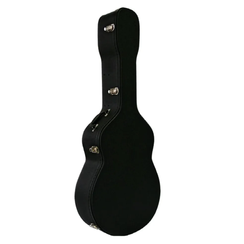 The V-Case Semi-Acoustic is a shaped plywood hardcase covered in black vinyl, arched at the top with grey plush lined interior, a covered accessory compartment with lock.