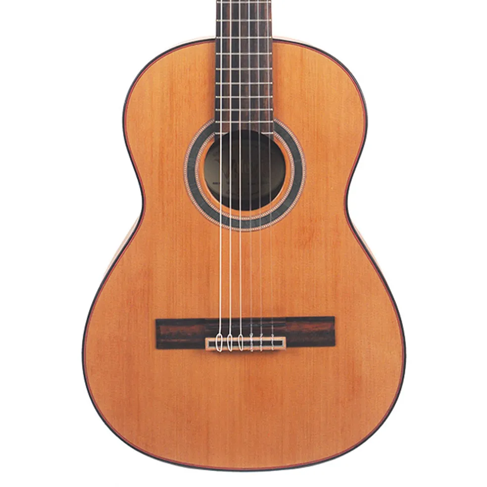 The neck is solid mahogany, for maximum transfer of string energy to the cedar top. An Amara Ebony fingerboard and bridge deliver exquisite playability and complete the elegant look. Other features such as exotic wood veneers, inlaid natural wood mosaic rosette and custom decorated machine heads make this guitar a true player’s choice.