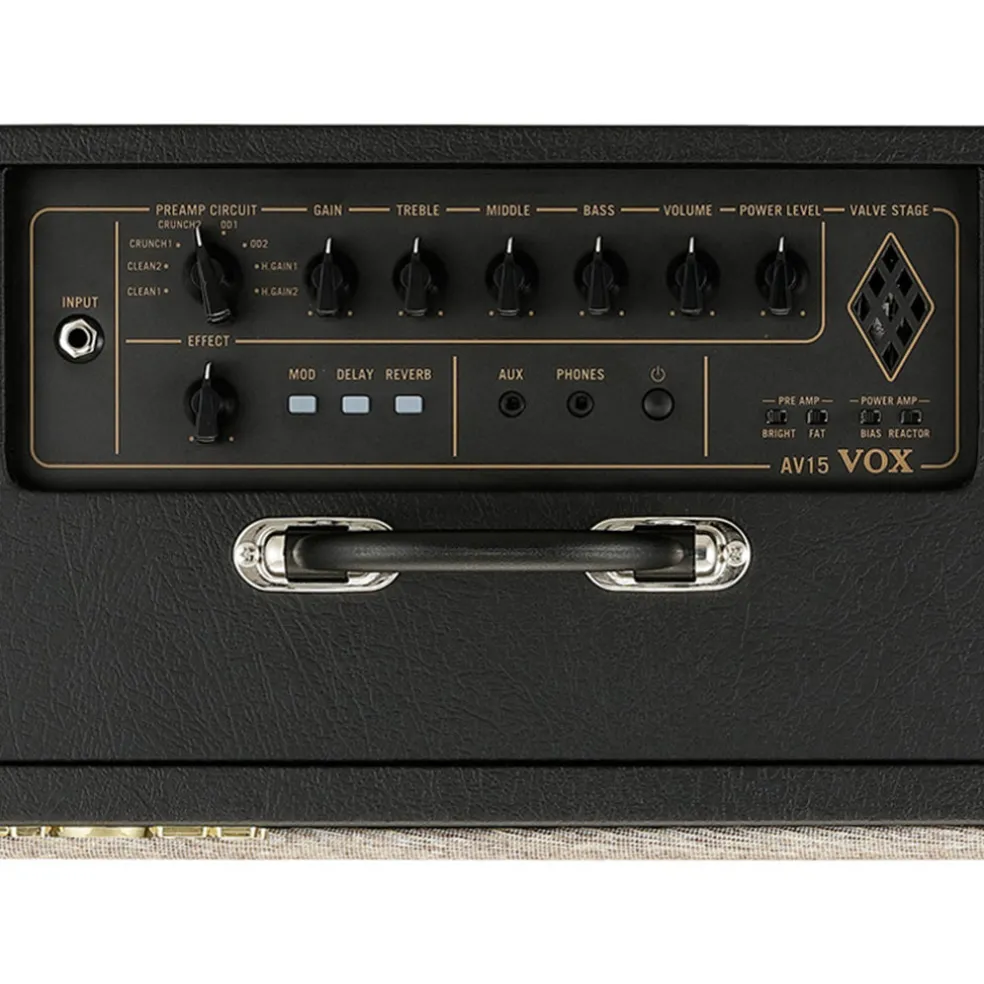 Designed for use at home or in the studio, the AV15 is a fully-featured analog amp that packs decades worth of tones into a compact package. The AV15’s tube-based, multi-circuit analog pre-amp provides a full complement of clean, crunch, overdrive, and high gain tones that can be tailored to your liking via the Bright and Fat switches. These classic tones are further enhanced by a customizable, tube equipped analog power section and a unique, sealed speaker enclosure for improved resonance. Rounding out the feature set are three, analog-voiced digital effects including Chorus, Delay & Reverb. Regardless of your playing style, the AV15 is well-equipped practice and recording tool that is sure to inspire and impress.