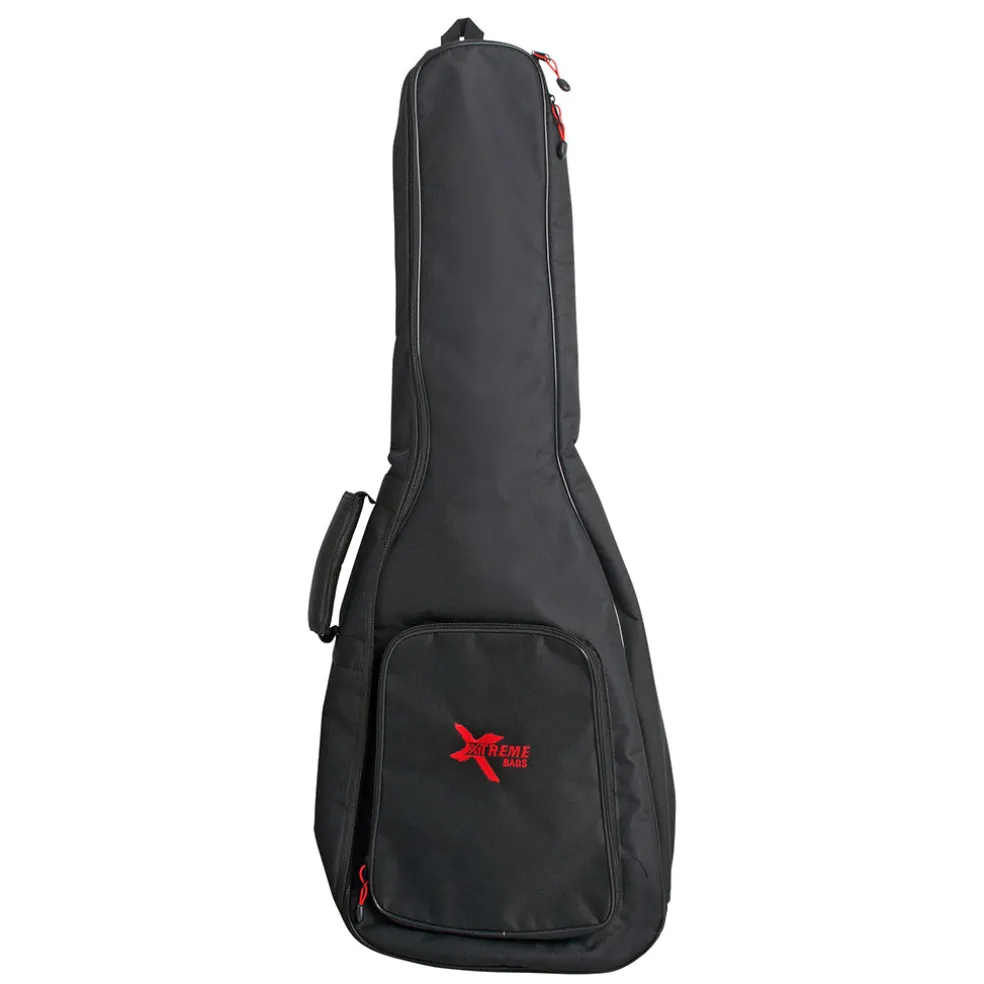 The Xtreme TB305W acoustic bag is a black heavy duty nylon yarn, 5mm sponge padded and lined, reinforced at head-stock and bridge. This bag features a full length zip, accessory pocket, cross stitched carry handle, 2 detachable shoulder straps with pads, heavy duty black metal clips, with additional ribbed vinyl protection on the lower front.