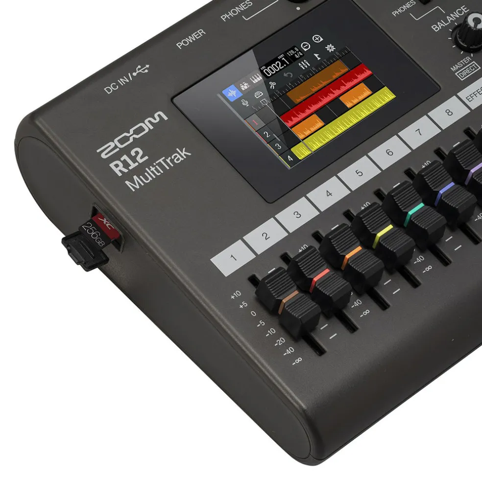 The R12 is made for musicians who live to make music. And they want the freedom to make music wherever they go. Compact and mobile, you can record and mix songs without a computer. Use the R12’s full-color LCD touchscreen to cut, copy, loop, and edit your tracks. The R12 has super-clean preamps and you’ll love the way they sound. With two XLR/TRS inputs, and 8 tracks of audio, the R12 is perfect for recording everything from demos to release-ready songs.
